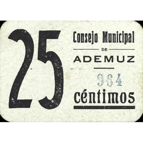 25 céntimos Consejo Municipal DE ADEMUZ (Translation: 25 Centimos Municipal Council of Ademuz) |