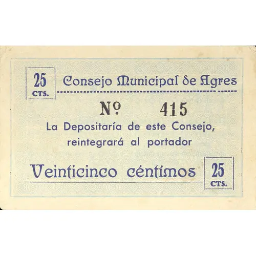 25 CTS. Consejo Municipal de Agres La Depositaría de este Consejo, reintegrará al portador Veinticinco céntimos (Translation: 25 Centimos Municipal Council of Agres The depository of this Council, will reimburse the bearer Twenty five Centimos) |
