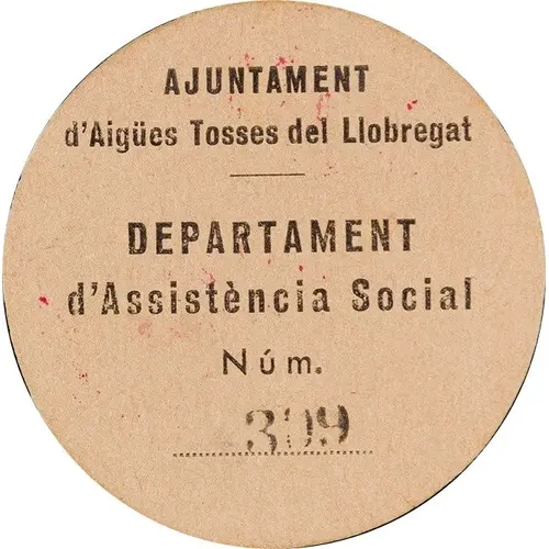 | Obverse lettering | AJUNTAMENT d`Aigües Tosses del Llobregat DEPARTAMENT d`Assistència Social Núm. 309 (Translation: City Council of Aigües Tosses del Llobregat Department of Social Assistance) |