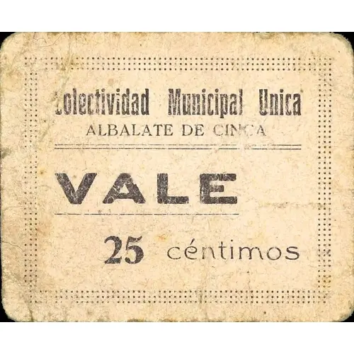 Colectividad Municipal Unica ALBALATE DE CINCA VALE 25 céntimos (Translation: Single Municipal Collectivity Albalate de Cinca Voucher 25 Centimos) |