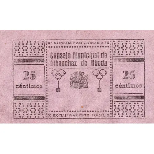 25 céntimos MONEDA FRACCIONARIA Consejo Municipal de Albanchez de Ubeda EXCLUSIVAMENTE LOCAL (Translation: 25 Centimos Fractional currency Municipal Council of Albanchez de Ubeda Exclusively local) |