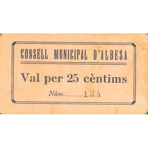 | Chữ khắc mặt trước | CONSELL MUNICIPAL D`ALBESA Val per 25 cèntims (Translation: Municipal Council of Albesa Valid for 25 Centimos) |