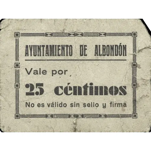 AYUNTAMIENTO DE ALBONDÓN Vale por 25 céntimos No es válido sin sello y firma (Translation: City Council of Albondón Valid for 25 Centimos Not valid without seal and signature) |