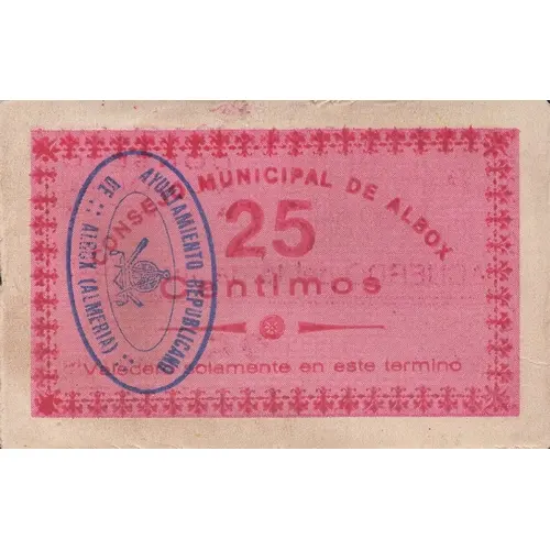 CONSEJO MUNICIPAL DE ALBOX 25 Céntimos Valedero solamente en este termino (Translation: Municipal Council of Albox 25 Centimos Valid only in this municipality) |