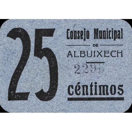 25 céntimos Consejo Municipal DE ALBUIXECH (Translation: 25 Centimos Municipal Council of Albuixech) |