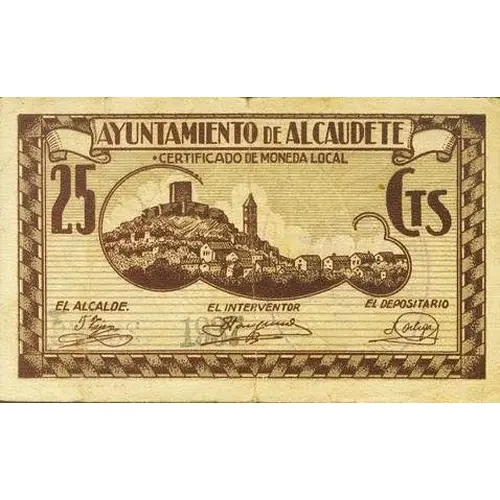AYUNTAMIENTO DE ALCAUDETE CERTIFICADO DE MONEDA LOCAL 25 CTS (Translation: City Council of Alcaudete Local currency certificate 25 Centimos) |