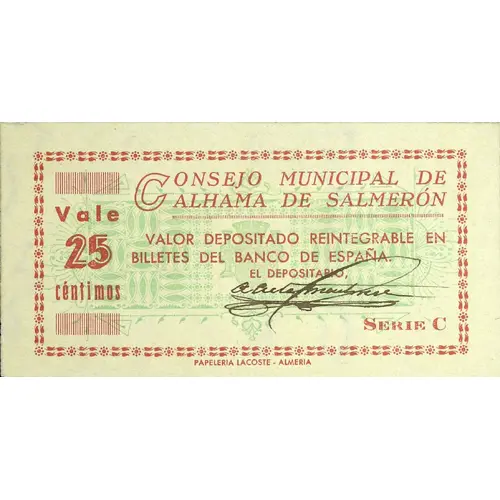 (Translation: Municipal Council of Alhama de Salmerón Value 25 Centimos Amount deposited refundable in banknotes of the Bank of Spain. Series C)