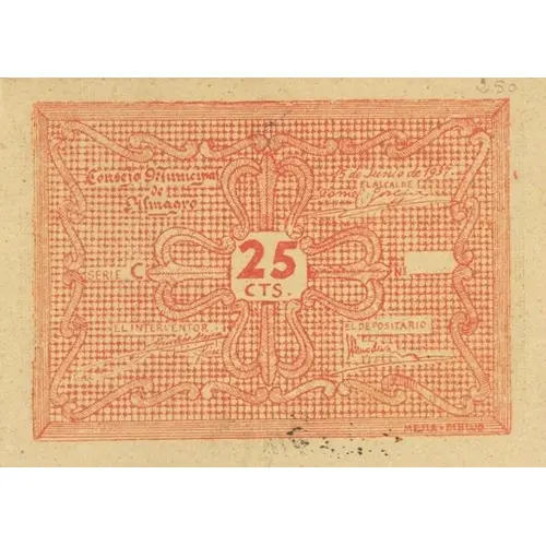 Consejo Municipal de Almagro 15 de Junio de 1937. 25 CTS. (Translation: Municipal Council of Almagro June 15, 1937. 25 Centimos) |