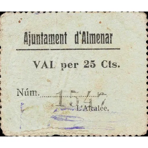 Ajuntament d`Almenar Val per 25 cts. (Translation: City Council of Almenar Voucher for 25 Centimos) |