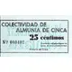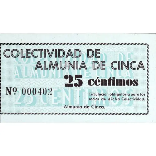 COLECTIVIDAD DE ALMUNIA DE CINCA 25 céntimos / 25 CENTIMOS Circulación obligatoria para los socios de dicha colectividad. Almunia de Cinca (Translation: Collectivity of Almunia de Cinca 25 Centimos / 25 Centimos Mandatory circulation for members of said Collectivity. Almunia de Cinca) |