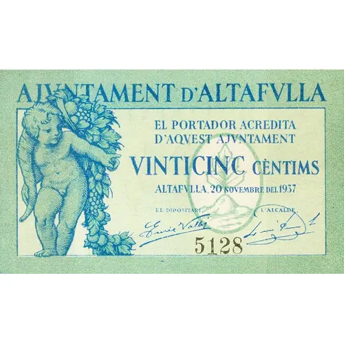 AJUNTAMENT D`ALTAFULLA EL PORTADOR ACREDITA D`AQUEST AJUNTAMENT VINTICINC CÈNTIMS ALTAFULLA, 20 NOVEMBRE DEL 1937 (Translation: City Council of Altafulla The bearer accredits from this City Council Twenty-five Centimos Altafulla, November 20, 1937) |