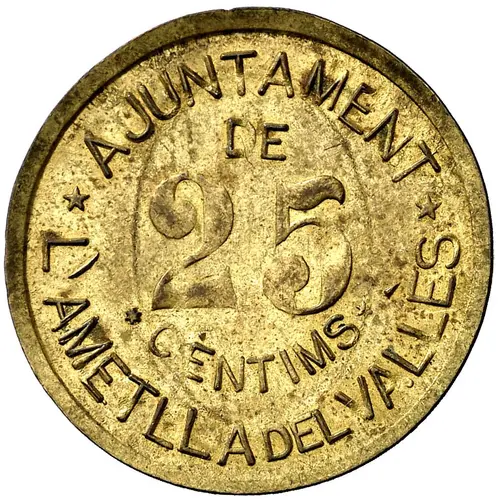 AJUNTAMENT DE *L`AMETLLA DEL VALLÈS* 25 *CÉNTIMS* (Translation: City Council of L`Ametlla del Vallès 25 Centimos) |