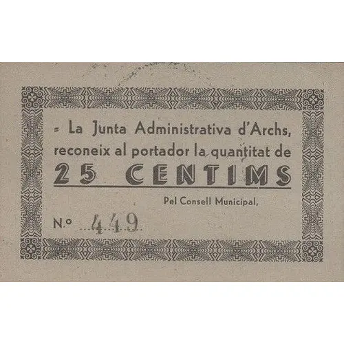 | Légende de l’avers | La Junta Administrativa d`Archs, reconeix al portador la quantitat de 25 CENTIMS Pel Consell Municipal, (Translation: The Administrative Board of Archs, recognizes te bearer the amount of 25 Centimos For the Municipal Council,) |