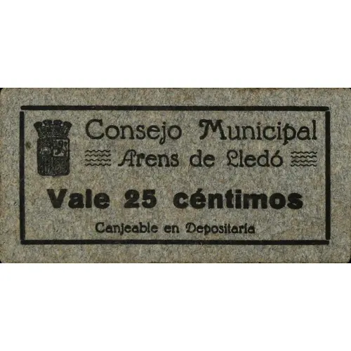 Consejo Municipal Arens de LLedó Vale 25 céntimos Canjeable en Tesorería (Translation: Municipal Council Arens de LLedó It`s worth 25 Centimos Redeemable in Treasury) |