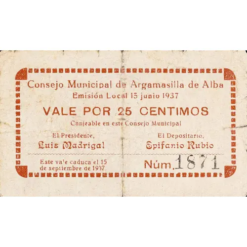 Consejo Municipal de Argamasilla de Alba Emisión Local 15 junio 1937 VALE POR 25 CENTIMOS Canjeable en este Consejo Municipal Este vale caduca el 15 de septiembre de 1937 (Translation: Municipal Council of Argamasilla de Alba Local issue June 15, 1937 Voucher for 25 Centimos Redeemable in this Municipal Council This voucher expires on September 15, 1937) |