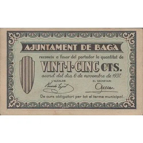 AJUNTAMENT DE BAGÀ reconeix a favor del portador la quantitat de VINT · I · CINC CÈNTIMS acord del dia 6 de novembre de 1937 De curs obligatori per tot el terme municipal (Translation: City Council of Bagà recognizes in favor of the bearer the amount of Twenty five Centimos agreement of November 6, 1937 Mandatory course throughout the municipality) |