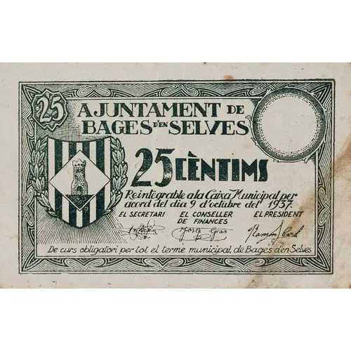 Obverse lettering 25 AJUNTAMENT DE BAGES D`EN SELVES 25 CÈNTIMS Reintegrable a la Caixa Municipal per acord del dia 9 d`octubre del 1937 De curs obligatori per tot el terme municipal de Bages d`en Selves