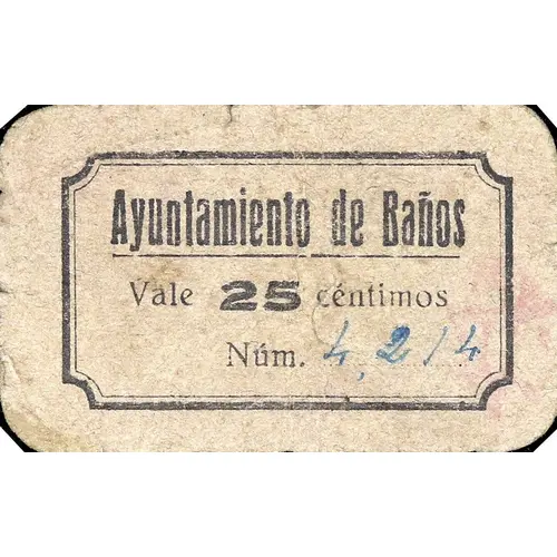| Opis líce | Ayuntamiento de Baños Vale 25 céntimos (Translation: City Council of Baños It is worth 25 Centimos) |