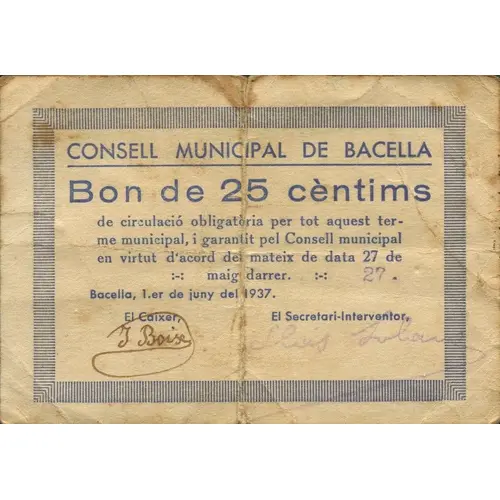 CONSELL MUNICIPAL DE BACELLA Bon de 25 cèntims de circulació obligatòria per tot aquest terme municipal, i garantit pel Consell municipal en virtut d`acord del mateix de data 27 de maig darrer. Bacella, 1.er de juny del 1937. (Translation: Municipal Council of Bacella Bond of 25 Centimos of mandatory circulation by all this municipal term, and guaranteed by the municipal Council by virtue of agreement of the same of date 27 May. Bacella, June 1, 1937.) |