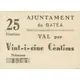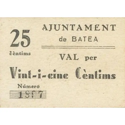 25 cèntims AJUNTAMENT de BATEA VAL per Vint-i-cinc Cèntims (Translation: 25 Centimos City Council of Batea Valid for Twenty five Centimos) |