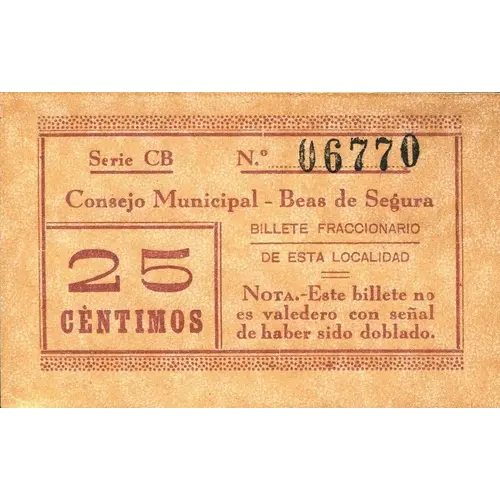 Consejo Municipal - Beas de Segura BILLETE FRACCIONARIO DE ESTA LOCALIDAD 25 CENTIMOS NOTA.- Este billete no es valedero con señal de haber sido doblado. (Translation: Municipal Council - Beas de Segura Fractional banknote of this town 25 Centimos Note.- This banknote is not valid with a sign of having been folded.) |