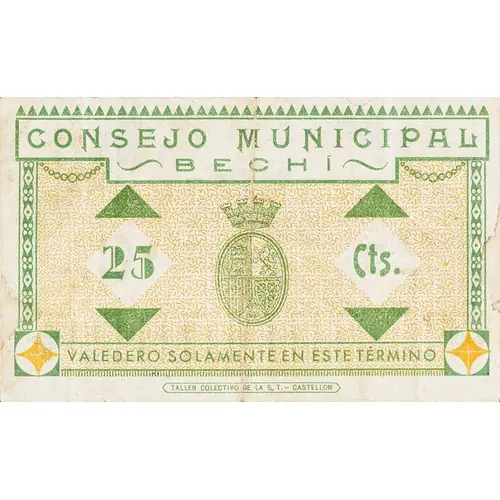 Vorderseitenlegende CONSEJO MUNICIPAL BECHÍ 25 Cts. VALEDERO SOLAMENTE EN ESTE TÉRMINO