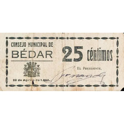 CONSEJO MUNICIPAL DE BÉDAR 25 céntimos 20 de Agosto de 1.937 (Translation: Municipal Council of Bédar 25 Centimos August 20, 1937.) |