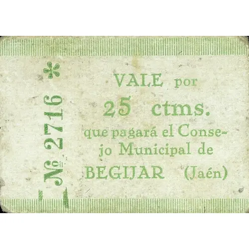 VALE por 25 ctms. que pagará el Consejo Municipal de BEGIJAR (Jaén) (Translation: It is worth 25 Centimos paid by the Municipal Council of Begíjar (Jaén)) |