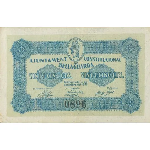 25 CTS. AJUNTAMENT CONSTITUCIONAL BELLAGUARDA VINT-I-CINC CÈNTIMS BITLLET DE CIRCULACIÓ OBLIGATORIA A TOTA LA JURISDICCIÓ MUNICIPAL (Translation: 25 Centimos Constitutional City Council Bellaguarda Twenty five Centimos Mandatory circulation banknote for all Municipal Jurisdiction) |