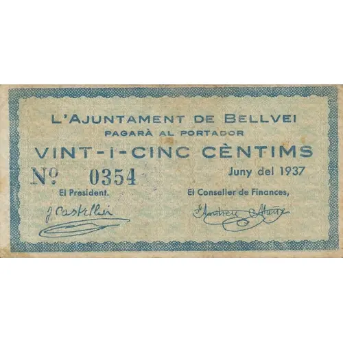 L`AJUNTAMENT DE BELLVEI PAGARÀ AL PORTADOR VINT-I-CINC CÈNTIMS Juny del 1937 (Translation: The City Council of Bellvei Will pay the bearer Twenty five Centimos June 1937) |