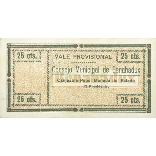 25 cts. VALE PROVISIONAL Consejo Municipal de Benahadux Canjeable Papel Moneda del Estado (Translation: 25 Centimos Provisional voucher Municipal Council of Benahadux Exchangeable Paper Money of the State) |