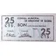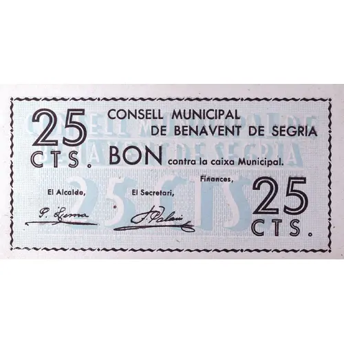 25 CTS. CONSELL MUNICIPAL DE BENAVENT DE SEGRIA BON contra la caixa Municipal. (Translation: 25 Centimos Municipal Council of Benavent de Segrià Bond against the Municipal Fund) |