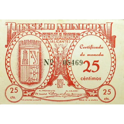 CONSEJO MUNICIPAL DE BENIARRES (ALICANTE) Certificado de moneda 25 céntimos 1937 25 cts. TIP. LVCENTVM-ALICANTE DIBVJO DE A. MARCO (Translation: Municipal Council of Beniarrés (Alicante) 25 Centimos currency certificate 1937 25 Centimos) |