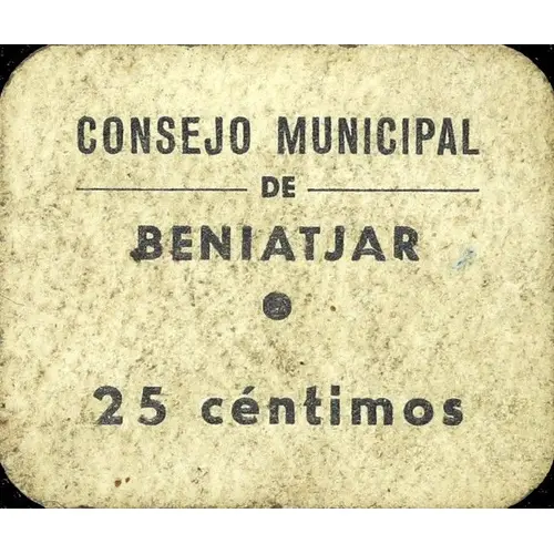 CONSEJO MUNICIPAL DE BENIATJAR 25 céntimos (Translation: Municipal Council of Beniatjar 25 Centimos) |