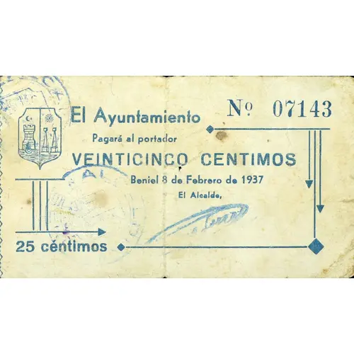 El Ayuntamiento de Beniel Pagará al portador VEINTICINCO CÉNTIMOS Beniel 8 de Febrero de 1937 25 céntimos (Translation: The City Council of Beniel Will pay the bearer Twenty-five Centimos Beniel, February 8, 1937 25 Centimos) |