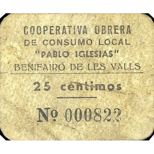 COOPERATIVA OBRERA DE CONSUMO LOCAL `PABLO IGLESIAS` BENIFAIRÓ DE LES VALLS 25 céntimos N.º 000822 (Translation: Local Consumer Workers` Cooperative `Pablo Iglesias` 25 Centimos) |