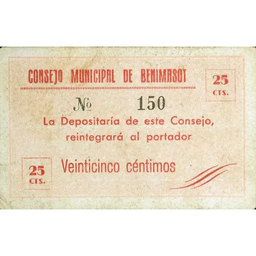 25 CTS. CONSEJO MUNICIPAL DE BENIMASOT La Depositaría de este Consejo, reintegrará al portador Veinticinco céntimos (Translation: 25 Centimos Municipal Council of Benimasot The depository of this Council, will reimburse the bearer Twenty five Centimos) |