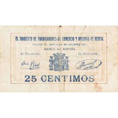(Translation: 25 Centimos Benisa, July 1, 1937 U.G.T. Commerce Department)