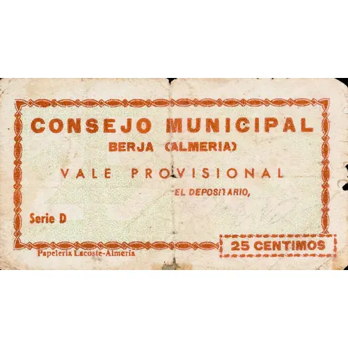 CONSEJO MUNICIPAL BERJA (Almería) VALE PROVISIONAL 25 CENTIMOS (Translation: Municipal Council Berja (Almería) Provisional voucher 25 Centimos) |