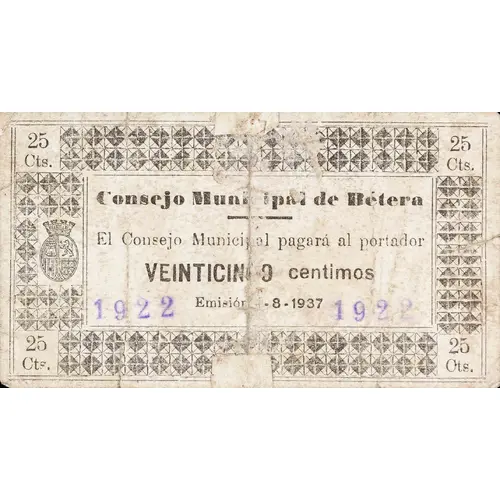 25 Cts. Consejo Municipal de Bétera El Consejo Municipal pagará al portador VEINTICINCO céntimos Emisión 1-8-1937 (Translation: 25 Centimos Municipal Council of Bétera The Municipal Council will pay the bearer Twenty-five Centimos Issue August 1, 1937) |