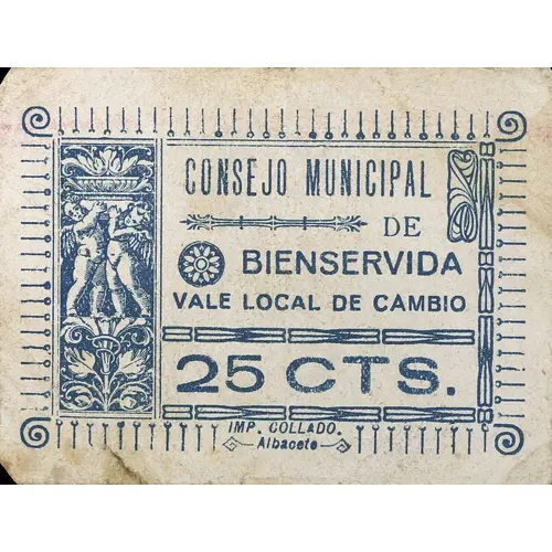 CONSEJO MUNICIPAL DE BIENSERVIDA VALE LOCAL DE CAMBIO 25 CTS. IMP. COLLADO. Albacete (Translation: Municipal Council of Bienservida Local exchange voucher 25 Centimos) |