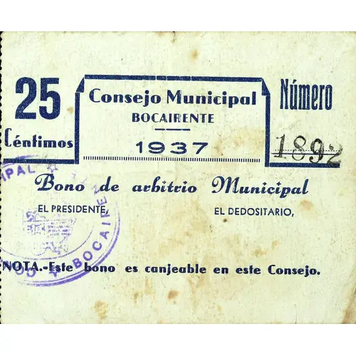 25 Cèntimos Consejo Municipal BOCAIRENTE 1937 Bono de arbitrio Municipal NOTA.- Este bono es canjeable en este Consejo. (Translation: 25 Centimos Municipal Council Bocairente Municipal arbitration bond Note.- This bond is exchangeable in this Council.) |