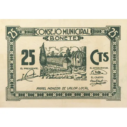 CONSEJO MUNICIPAL BONETE 25 CTS PAPEL MONEDA DE VALOR LOCAL (Translation: Municipal Council Bonete 25 Centimos Paper money of local value) |