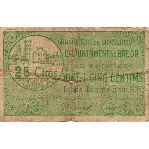 25 Ctms. GARANTITZAT DE CIRCULACIÓ L`AJUNTAMENT DE BREDA pagarà al portador VINT-i-CINC CÈNTIMS Breda 11 de maig del 1937 (Translation: 25 Centimos Guaranteed circulation The City Council of Breda will pay the bearer Twenty five Centimos Breda May 11, 1937) |
