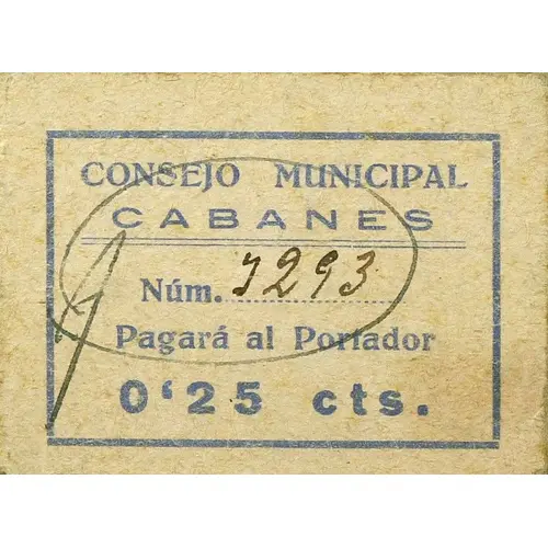 CONSEJO MUNICIPAL CABANES Pagará al Portador 0`25 cts. (Translation: Municipal Council Cabanes Will pay the bearer 0.25 Centimos) |