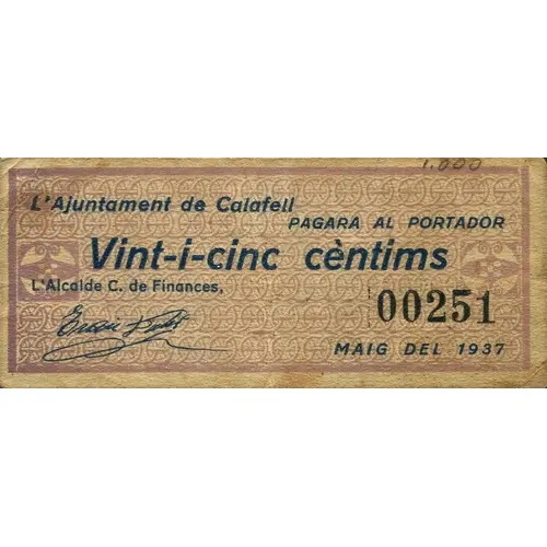 L`Ajuntament de Calafell PAGARA AL PORTADOR Vint-i-cinc cèntims MAIG DEL 1937 (Translation: The City Council of Calafell Will pay the bearer Twenty five Centimos May 1937) |