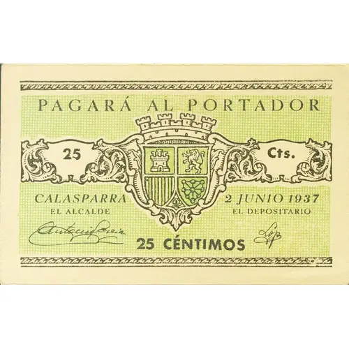 PAGARÁ AL PORTADOR 25 Cts. CALASPARRA / 2 JUNIO 1937 25 CÉNTIMOS (Translation: Will pay the bearer 25 Centimos Calasparra / June 2, 1937 25 Centimos) |