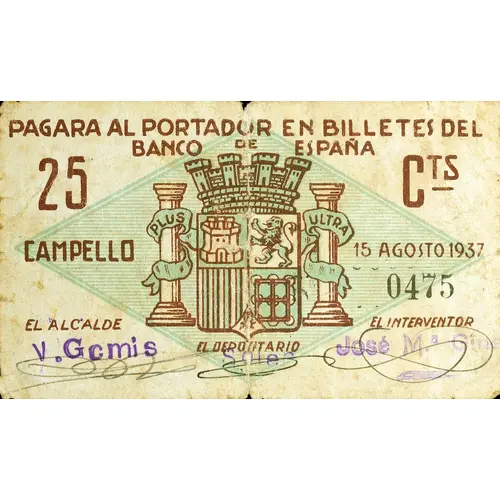 PAGARA AL PORTADOR EN BILLETES DEL BANCO DE ESPAÑA 25 CTS CAMPELLO - 15 AGOSTO 1937 (Translation: Will pay the bearer in banknotes of the Bank of Spain 25 Centimos Campello - August 15, 1937) |