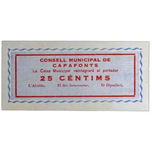 CONSELL MUNICIPAL DE CAPAFONTS La Caixa Municipal reintegrará al portador 25 CÉNTIMS (Translation: Municipal Council of Capafonts The Municipal Fund will reimburse the bearer 25 Centimos) |