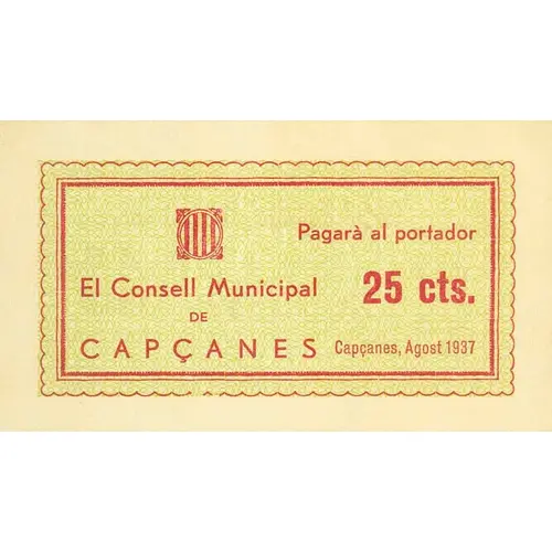 El Consell Municipal de CAPÇANES Pagarà al portador 25 cts. Capçanes, Agost del 1937 (Translation: The Municipal Council of Capçanes Will pay the bearer 25 Centimos Capçanes, August 1937) |